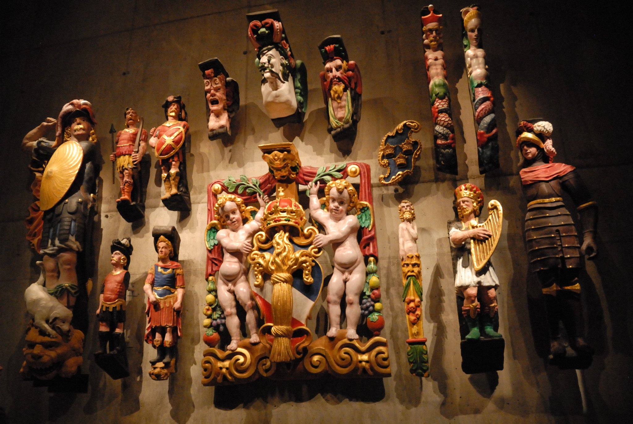 Replicas of some of the ship's sculptures that have been painted in what are believed to be the original colors.