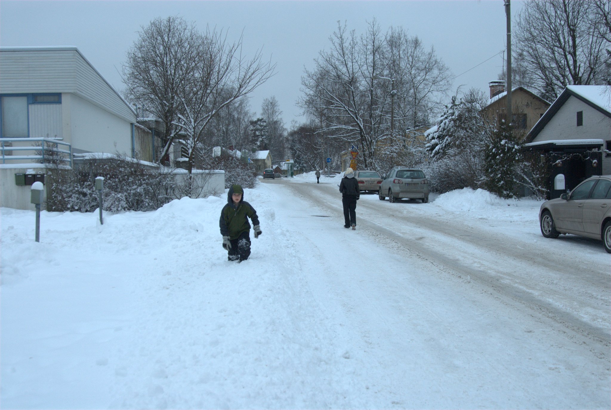 Tuomas and Antti climbing on a pile of snow while waiting for the bus