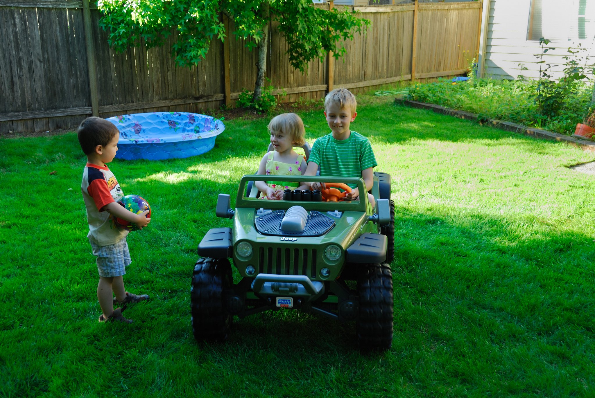 Antti, Johanna and Elsa looking at airplanes on granpa's trampoline